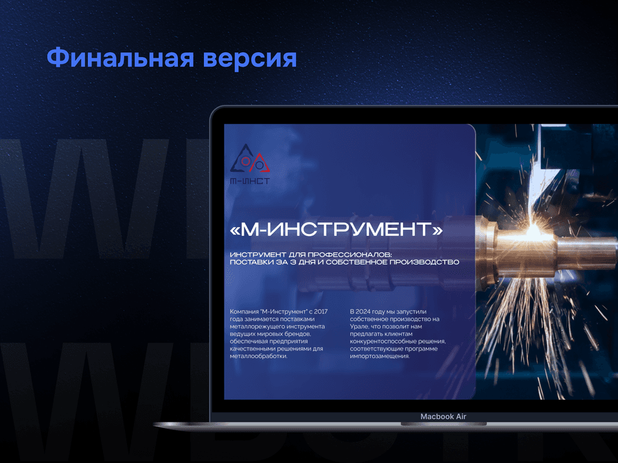 В результате компания получила презентацию, которая логично продолжает обновлённый сайт и поддерживает единый фирменный стиль. Материал получился понятным, аккуратным и удобным для использования в продажах. Презентация быстро объясняет, чем занимается «М-инструмент», показывает основные направления работы и помогает донести до клиента суть компании без перегруза и лишних пояснений.